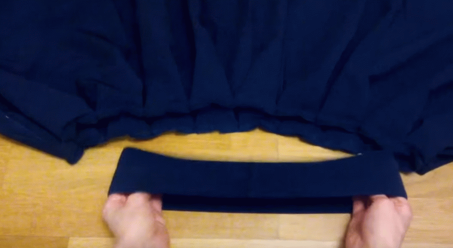 Acest lucru este necesar pentru a distribui uniform tensiunea. gumă în timp ce coaseți. Elasticul trebuie amplasat deasupra și țesătură din partea de jos. Coase țesătură, coase cusături, datorită acestui lucru pe țesătură sunt create pliuri mici, iar fusta devine egală cu circumferința talie și elastic.